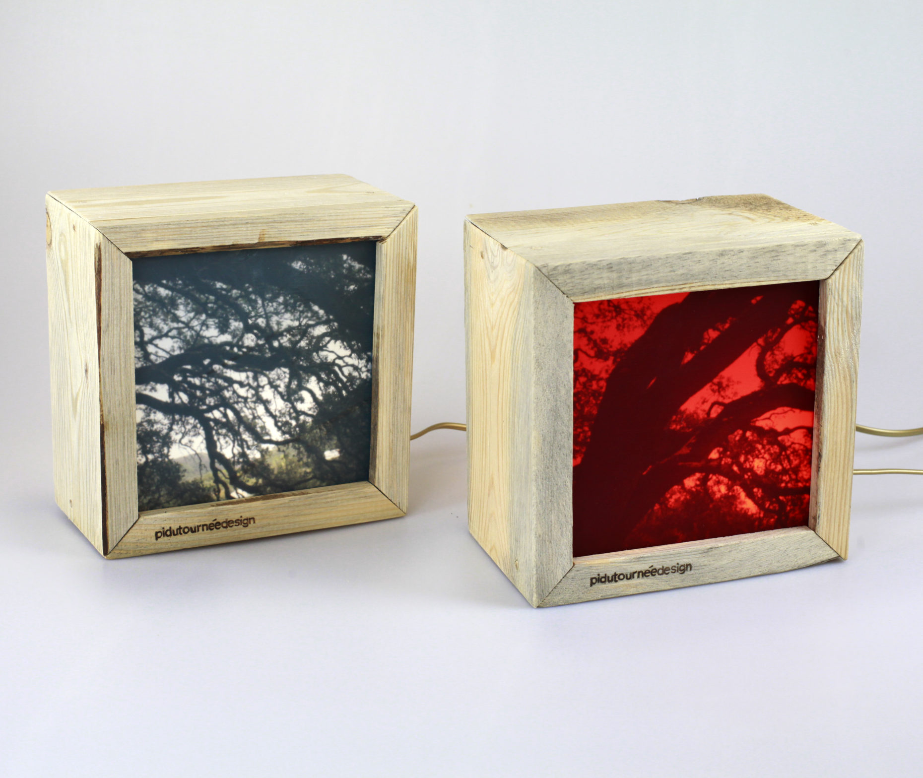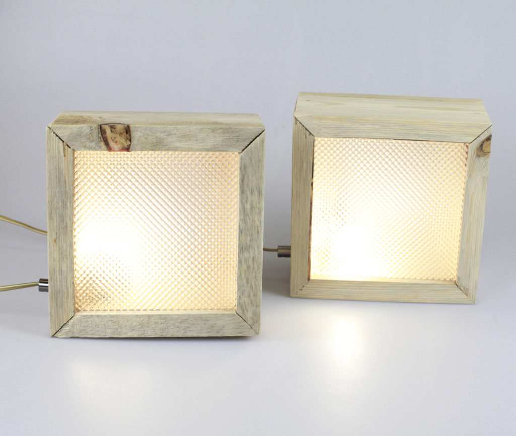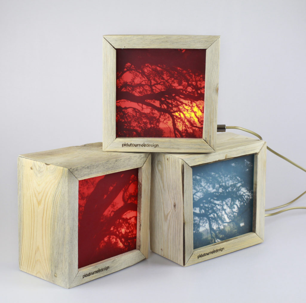 Caixa Bee (2017) – É uma luminária de mesa construída com madeira reaproveitada (pinho), desperdícios de acrílico e impressão fotográfica em backlight.